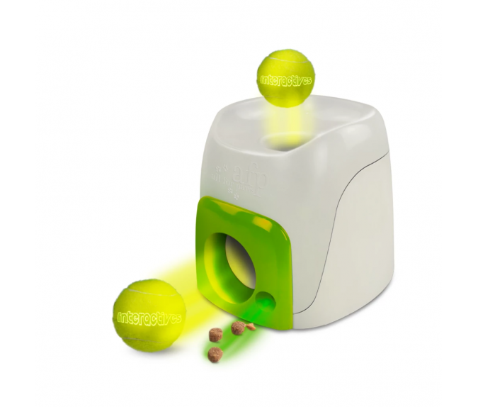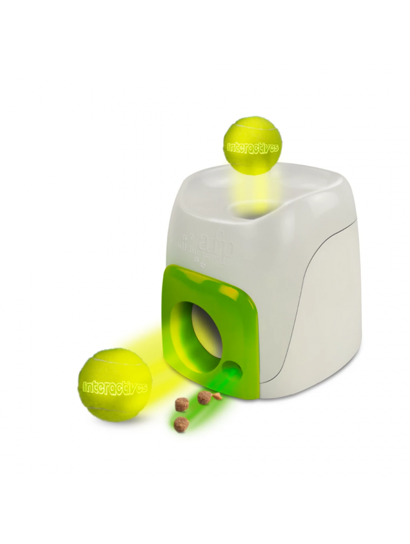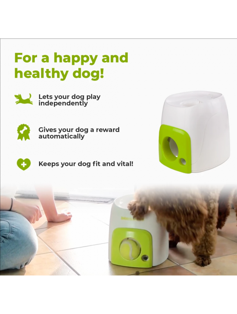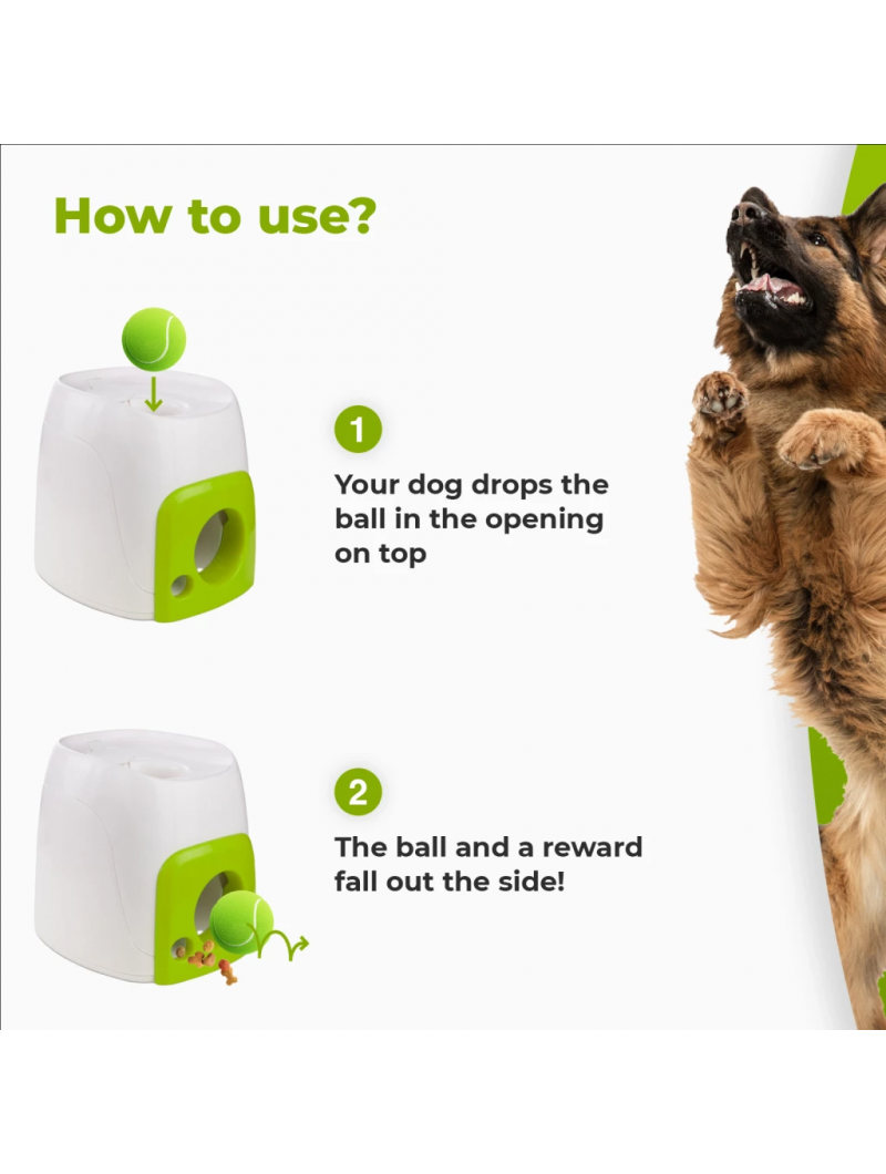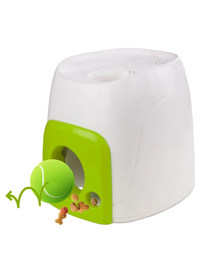 Po umieszczeniu piłki tenisowej (w zestawie) w otworze na górze, klapka automatycznie się otwiera i wypuszcza nagrodę dla psa. Fetch’N'Treat ma oddzielne komory, w których można schować smakołyki. Naucz psa korzystania z urządzenia, aby mógł bawić się nim samodzielnie!